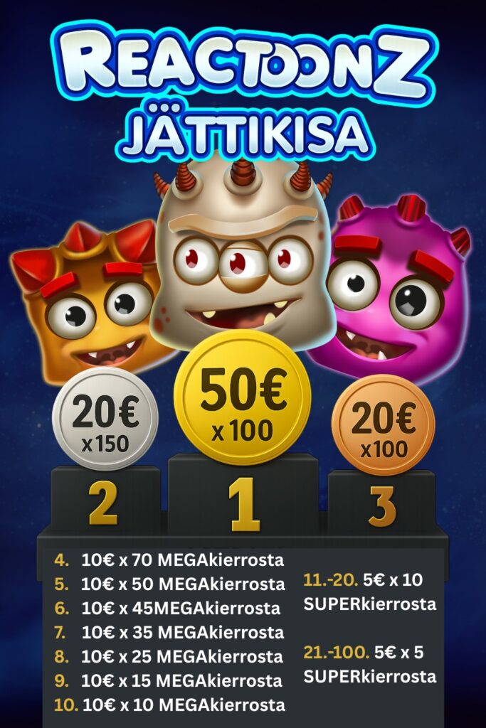 USKOMATON REACTOONZ JÄTTIKISA - Voita 100 kappaletta 50€ jättikierroksia